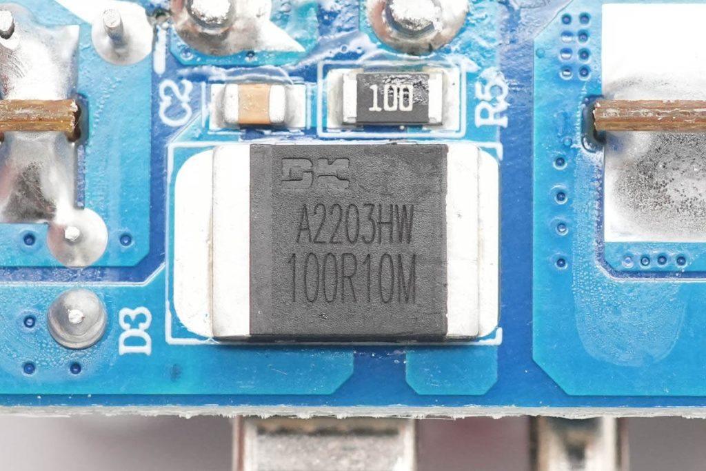 同步整流芯片來自東科,絲印100R10M,實際型號為DK5V100R10M,是一款零外圍的同步整流芯片,內置100V耐壓,10mΩ導阻的同步整流管,支持CCM,DCM和QR運行模式,可直接替代肖特基二極管,提升電源轉換效率。